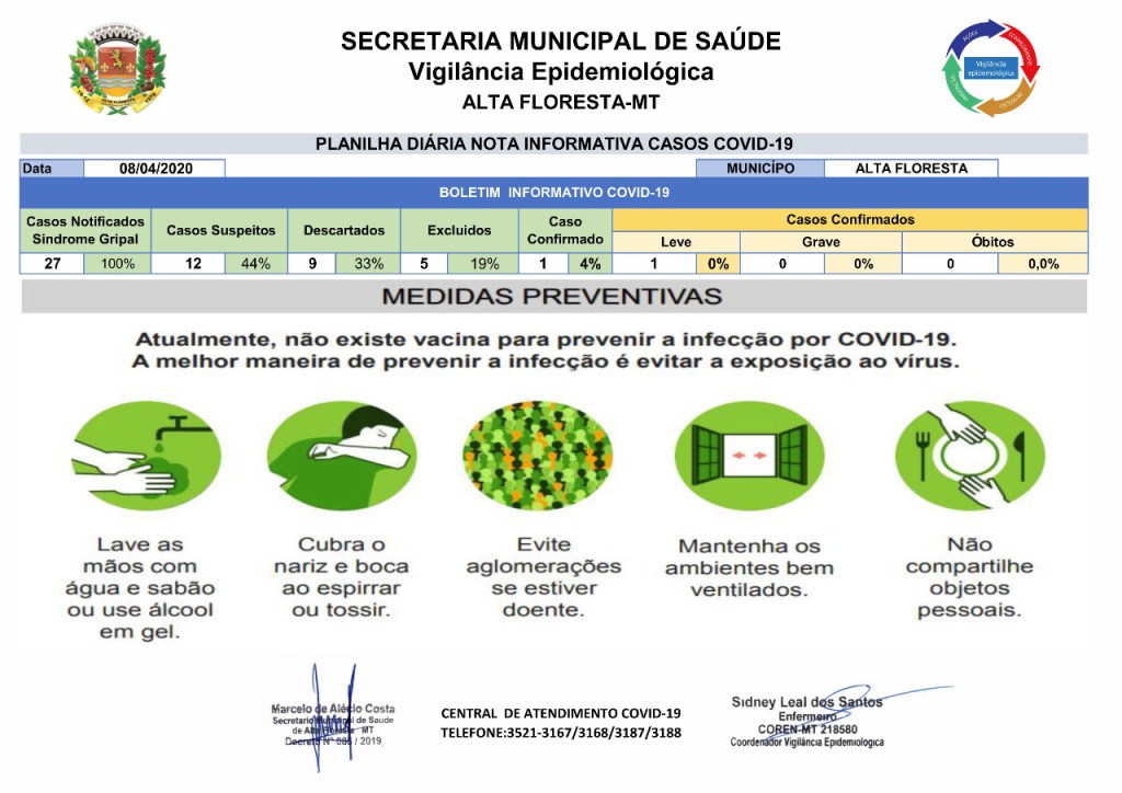 Segundo Boletim divulgado há pouco pelo Departamento de Vigilância Epidemiológica de Alta Floresta (acima), comparando-o com o de ontem, mais seis casos suspeitos na cidade testaram negativo para a COVID-19 e agora são considerados descartados.