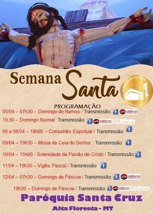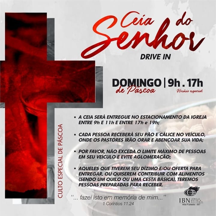 Da mesma forma, a Igreja Batista Nacional de Alta Floresta tem se valido das redes sociais para divulgar suas atividades. Amanhã também realizará cultos especiais de Páscoa on-line, além da Santa Ceia, no estacionamento da igreja: