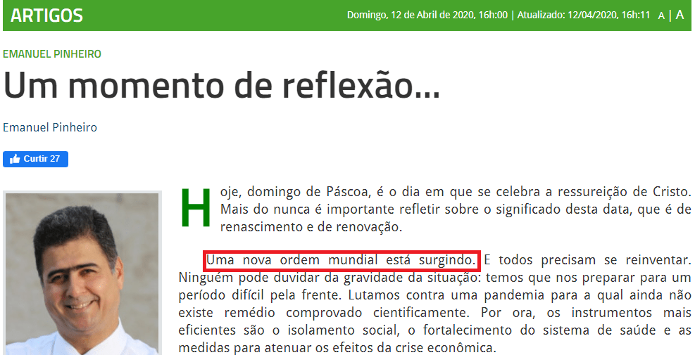 Em artigo divulgado ontem (12) pelo site RD News, o prefeito de Cuiabá, Emanuel Pinheiro, afirmou: “Uma nova ordem mundial está surgindo”.