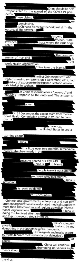 Então publicou imagem da Declaração chinesa com tarjas pretas sobre algumas palavras, imitando a censura típica de ditaduras. Eis o resultado – engraçado se não fosse trágico: