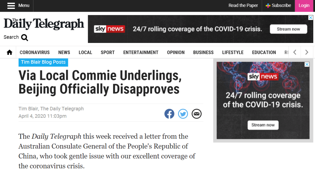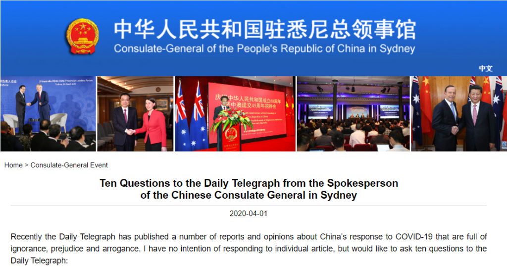 Os protagonistas da vez são o The Daily Telegraph, jornal localizado em Sydney que também tem realizado cobertura bastante crítica da crise causada pelo novo coronavírus, chamando a China à responsabilidade, e o Consulado Geral da República Popular da China na mesma cidade, incomodado com a postura do periódico.