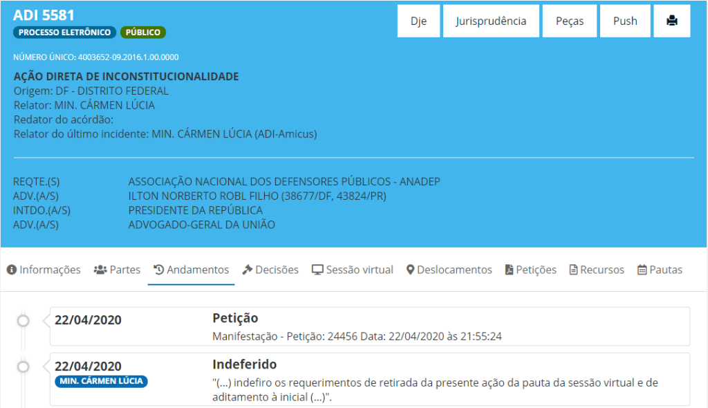 Dias atrás, a Associação Nacional de Defensores Públicos (ANADEP), autora da ação, havia solicitado a retirada de pauta do processo. Porém, hoje (22) a ministra Carmen Lúcia, relatora do caso, indeferiu o pedido.