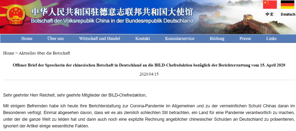 A exemplo do TDT, o Bild, maior jornal alemão, tem cobrado publicamente a responsabilidade da China pela crise ocasionada pela COVID-19.