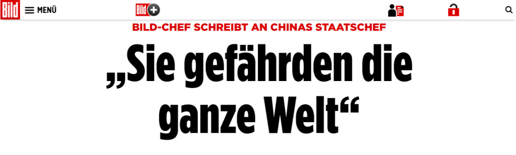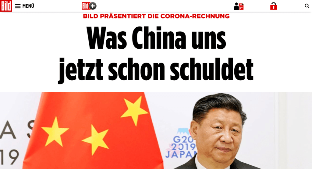Em 15 de abril, o jornal publicou editorial intitulado “Was China uns jetzt schon shuldet” (“O que a China já nos deve agora“). Acima, também foi categórico: “Bild apresenta a conta do corona“.