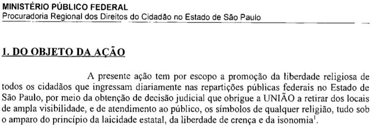 O processo iniciou em 2009, quando o MPF propôs ação civil pública perante a Justiça Federal de São Paulo, objetivando a “obtenção de decisão judicial que obrigue a UNIÃO a retirar dos locais [repartições públicas federais de São Paulo] de ampla visibilidade, e de atendimento ao público, os símbolos de qualquer religião, tudo sob o amparo do princípio da laicidade estatal, da liberdade de crença e da isonomia.”