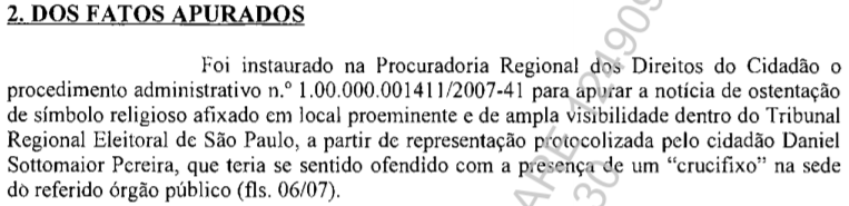O MPF alega na petição inicial que a ação foi proposta após ter conhecimento de representação formulada por um cidadão que teria se sentido ofendido com a presença de crucifixo na sede do Tribunal Regional Eleitoral de São Paulo.