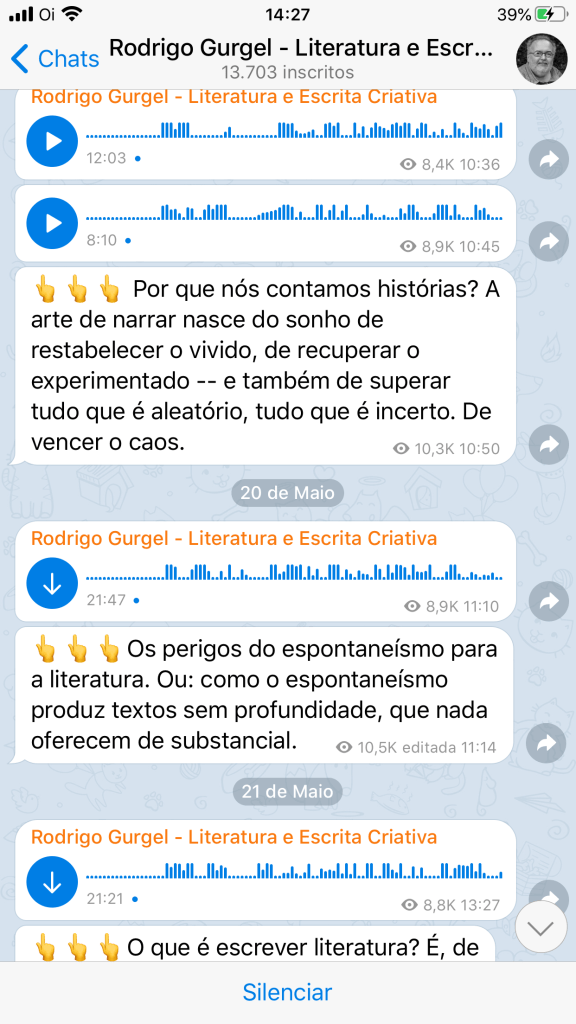 E não perca as gravações de áudio DIÁRIAS e GRATUITAS que o professor envia em seu grupo no aplicativo Telegram (uma espécie de Whatsapp), acessível a qualquer pessoa. Para se juntar ao grupo, clique aqui.