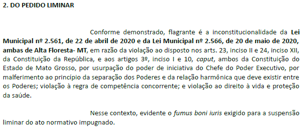 Questiona a constitucionalidade das leis municipais nº 2.561 e 2.566 – aquelas que a Câmara de Vereadores aprovaram e permitiram, na prática, a retomada do funcionamento das atividades em geral.