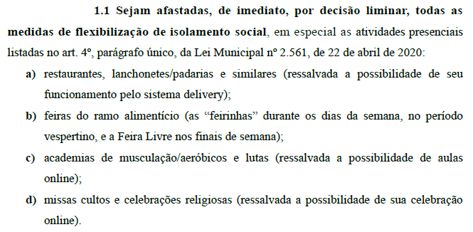 Apesar de pedirem genericamente a suspensão imediata de “todas as medidas de flexibilização de isolamento social”, os autores da demanda se concentram em solicitar a suspensão das atividades presenciais de restaurantes, padarias, bares, lanchonetes, feiras, academias e igrejas: