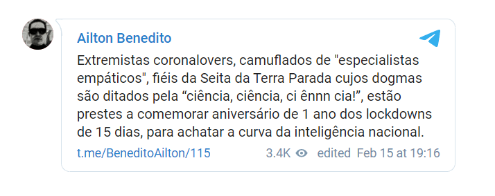 Lockdowns e o achatamento da… inteligência por Thiago Reis de Oliveira Postado em 16/02/202128/05/2021 Reprodução adaptada/Instagram @amanda_aps Recordar é viver! Em seu canal no Telegram, o procurador da república Ailton Benedito, atual secretário de direitos humanos da Procuradoria Geral da República, lembra o aniversário dos lockdowns: Compartilhar: Compartilhar no Facebook(abre em nova janela) Facebook Compartilhar no X(abre em nova janela) 18+ Compartilhar no WhatsApp(abre em nova janela) WhatsApp Compartilhar no Telegram(abre em nova janela) Telegram Enviar um link por e-mail para um amigo(abre em nova janela) E-mail Imprimir(abre em nova janela) Imprimir Curtir Carregando...